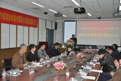 2012年4月6日,国家超级计算天津中心——中国传媒大学战略合作框架协议签约暨联合实验室揭牌仪式在我校综合实验楼904会议室举行。中国传媒大学校长苏志武、副校长高福安,国家超级计算天津中心主任刘光明、副主任罗军等出席签约仪式。签约仪式由我校科技处处长车晴主持。