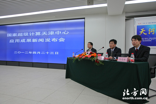 2012年4月23日,天津滨海新区科委、国防科学技术大学和国家超级计算天津中心联合召开“天河一号”超级计算机应用成果新闻发布会,新闻发布会由滨海新区科委主任黄亚楼主持,滨海新区郭景平副区长,国防科技大学计算机学院刘学民政委,国家超级计算天津中心刘光明主任出席。同时,中石油东方地球物理公司、上海药物所、国家动漫产业示范园等数十家重点用户代表,来自英国、德国、西班牙、瑞士、法国、挪威等参加中欧超级计算战略合作项目启动会议的欧盟专家,以及来自北航、中科院软件所、北京应用物理与计算数学研究所等多位国内高性能计算领域专家出席发布会。人民日报、中央电视台、新华社、光明日报、科技日报、中国日报、香港文汇报和天津日报等国内外近40家重要媒体单位参加发布会并现场报道。