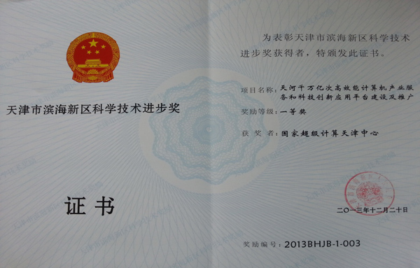 国家超级计算天津中心的“天河千万亿次高效能计算机产业服务和科技创新应用平台建设及推广”项目获滨海新区科技进步一等奖。