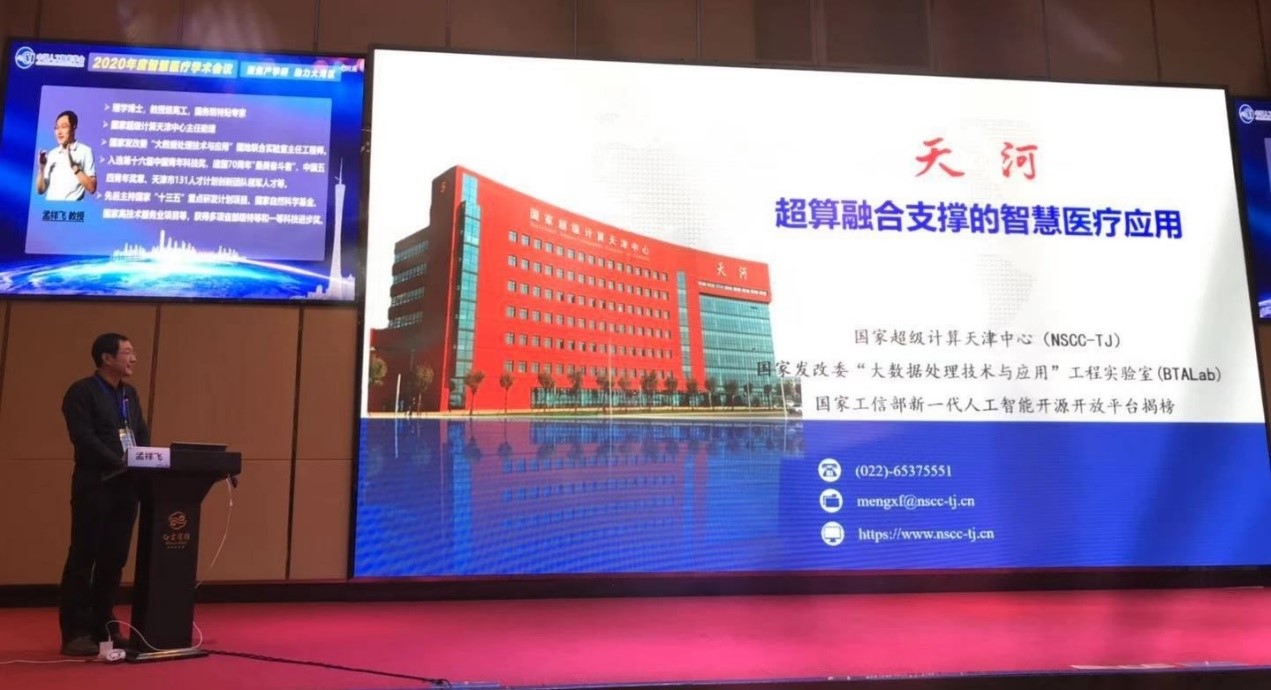 由中国人工智能学会主办,中国人工智能学会智慧医疗专委会等多家单位承办的2020年度智慧医疗学术会议于2020年12月11日—12日在广州市举行,来自人工智能科技领域、医疗科研单位、高校医疗科技企业的专家学者聚焦人工智能技术与智慧医疗应用深度融合,开展了深入交流,国家超级计算天津中心作为支持单位助力会议顺利召开。天津超算中心孟祥飞博士应邀进行主旨演讲,围绕如何依托超级计算开展智慧医疗创新实践,系统分享了基于天河人工智能创新一体化平台,天津超算中心在医学大数据综合分析、智能医学影像、智能患者风险评估、数字人体装置等方面取得的进展与成效。