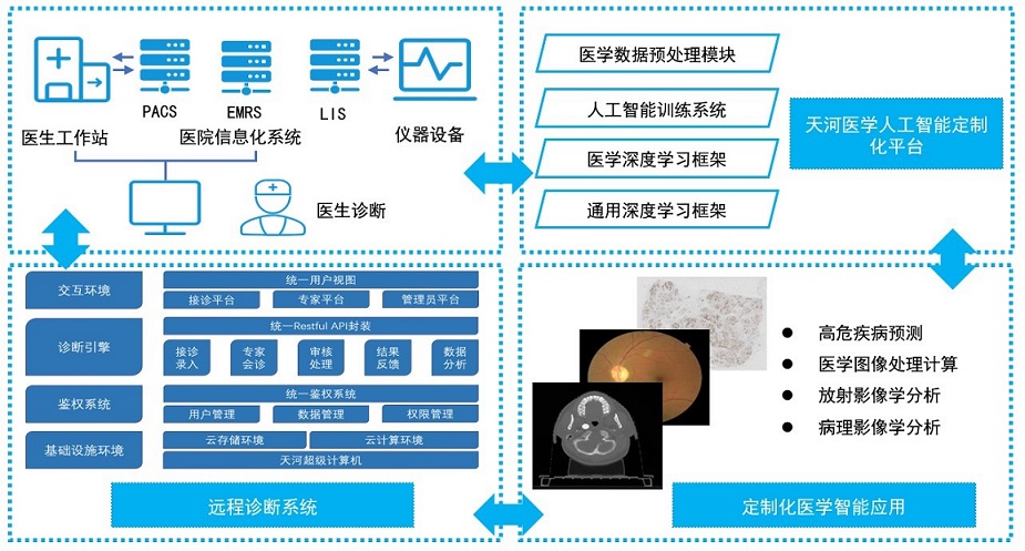 国家超级计算天津中心依托超级计算,坚持场景驱动,构建了“算力、数据、算法”一体的面向产学研用协同的人工智能创新一体化平台,打造了天河医疗人工智能研发支撑环境。通过与国内医院、科研院所密切合作,开展了医学影像辅助诊断、病理分析、患者风险评估、数字医学人体装置、基因大数据分析、慢病大数据管理、远程智能诊断、新药研发等一系列研究与应用实践,在智慧医疗领域形成了天河研发与服务特色,在示范情景打造、医疗业务提升、全民主动健康方面形成了良好的社会效益。
