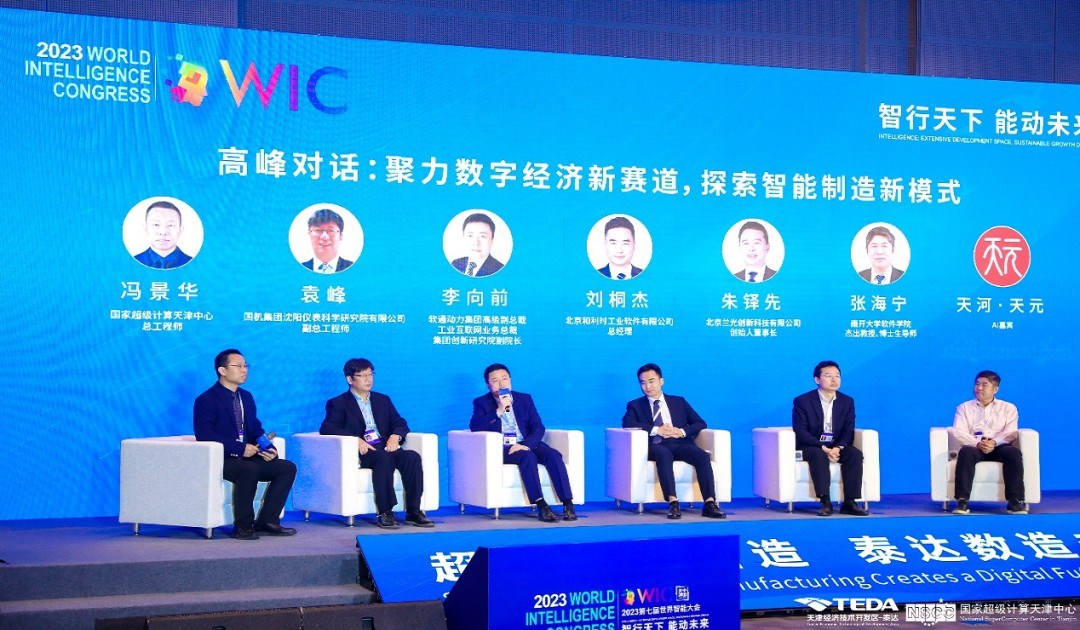 高峰对话环节由天津超算中心总工程师冯景华主持,邀请了国机传感科技有限公司、软通动力集团、北京兰光创新科技有限公司、北京和利时工业软件有限公司、南开大学软件学院等智能制造行业企业、院校大咖同台“论剑”,围绕“聚力数字经济新赛道,探索智能制造新模式”主题展开探讨。除此之外,也邀请到一位神秘的AI嘉宾——“天河·天元”。“天河天元”是立足于国产天河超级算力和智能算力打造的生成式AI大模型。未来,以生成式AI为基座的产业链将成为智能化升级过程中可大规模复用的基础设施。