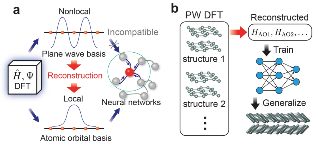 a 平面波(PW)基组相对原子轨道(AO)基组有更高的精度和更广泛的应用,但深度学习电子结构计算方法往往只支持局域的原子轨道基组。研究中最新开发的方法可以利用平面波DFT计算结果重构原子基组哈密顿量,从而平面波DFT可与深度学习方法兼容。b 兼容平面波基组的深度学习电子结构计算方法的工作流程。首先在包含较小材料体系的数据集上进行平面波基组的DFT计算,然后由这些计算结果重构得到对应的原子轨道基组哈密顿量。在这些哈密顿量上训练的神经网络即可用于研究未知的大尺度材料体系。